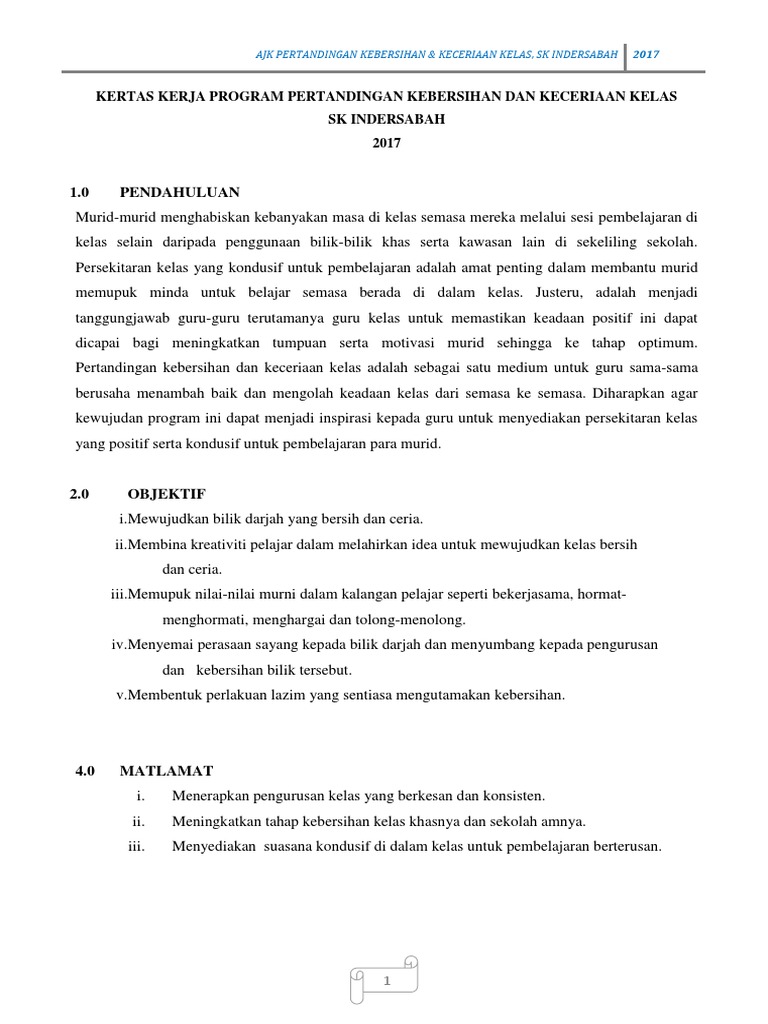 . Kertas Kerja Pertandingan Kebersihan Dan Keceriaan Kelas Author. Kebersihan kesihatan dan keselamatan3k adalah merupakan satu program yang berhasrat menjadikan sekolah sebagai organisasi pendidikan yang mempunyai kemudahan fizikal dan infrastruktur yang selamat. Penutup Contoh Kertas Kerja.